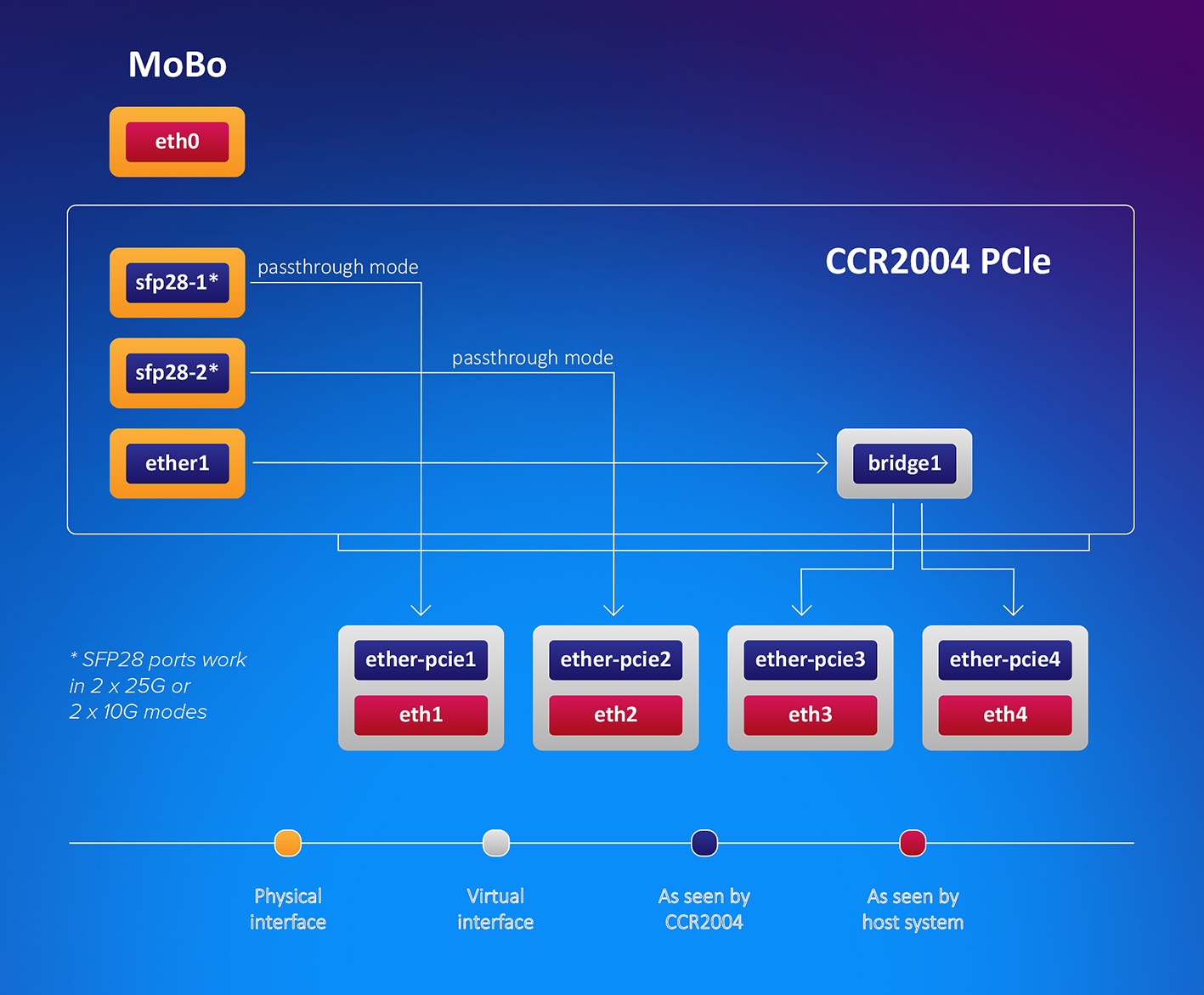 Quite importantly, this device offers you a unique feature. If you employ this NIC with the Passthrough mode and connect it to a virtual machine - a Cloud Hosted Router (CHR), for instance - all interfaces will be detected as regular interfaces and the device will be shown as a native hardware, which can perhaps be regarded as one its main benefits and functions.