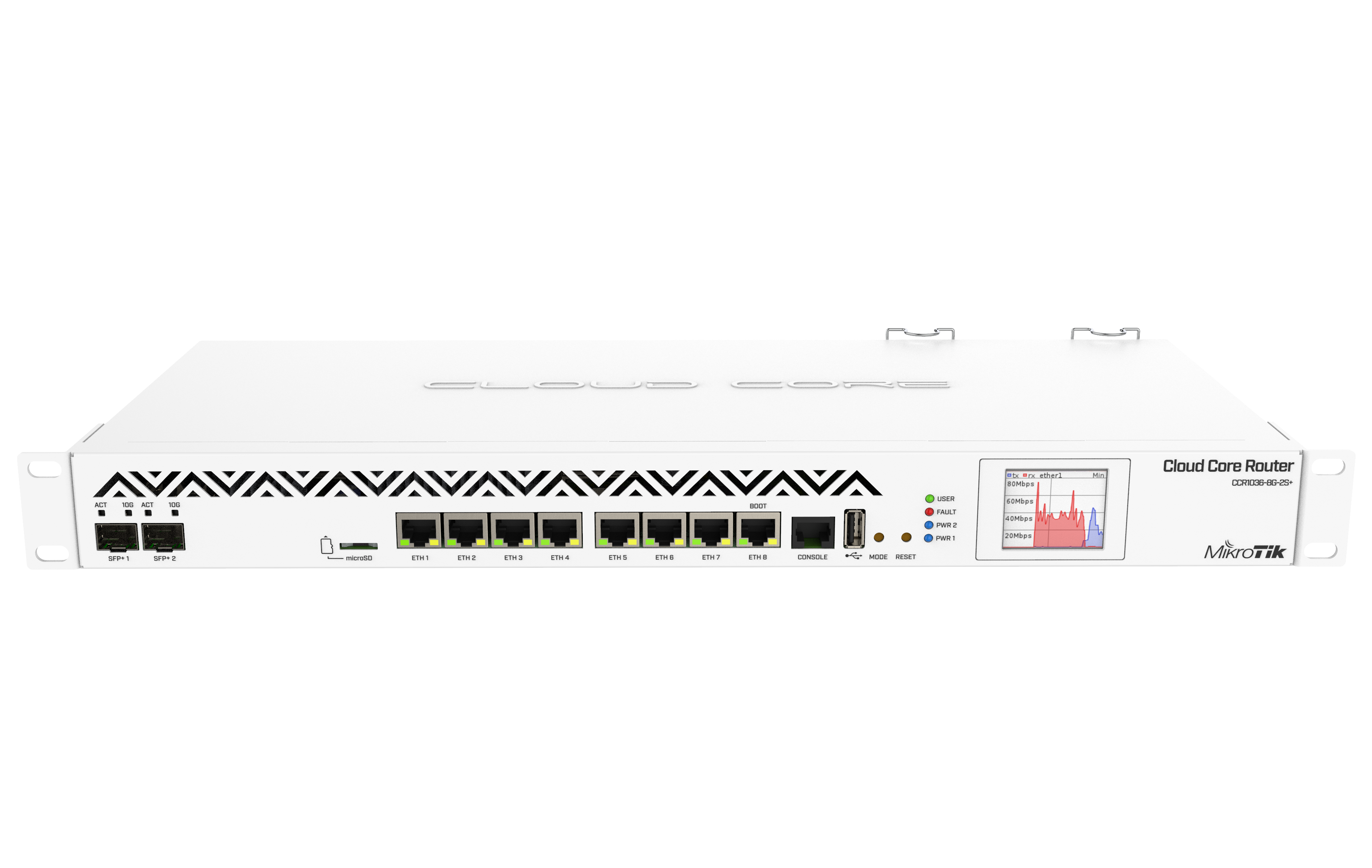 While the CCR1036-12G-4S and its EM version have 12 gigabit Ethernet ports and 4 SFP ports, the CCR1036-8G-2S+ have 8 gigabit Ethernet ports and 2 SFP+ ports, enabling this family of Ethernet routers to provide users with over 10 Gbps up to about 28 Gbps of throughput!