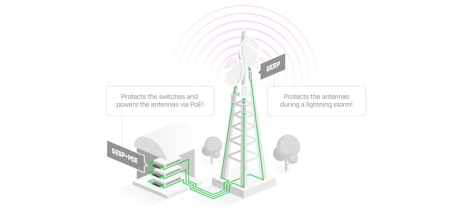 For further protection to your devices on the ground, as well as a power alternative for the antennas, you can use the GESP+POE-IN. In case you're located in regions with frequent storms and lightning showers, using a surge protector on both ends of long wires is recommended.