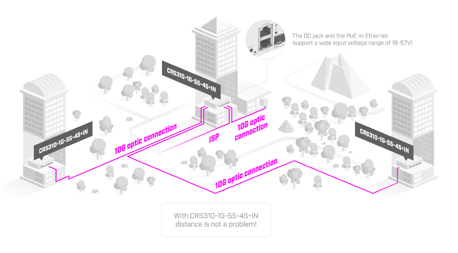 The CRS310 works quite efficiently for indoor connections exceeding 100 meters, and it is able to keep data loss and your ping noticeably low. For the best experience, seek optical fiber to avoid any type of intereference, electromagnetic or otherwise.