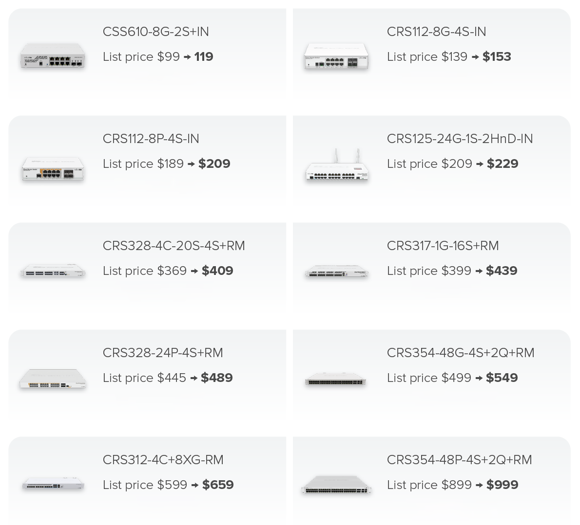 Effective as of March 31, 2022, MikroTik has adjusted the prices of 10 devices, comprised of 9 Cloud Router Switches and one Cloud Smart Switch.