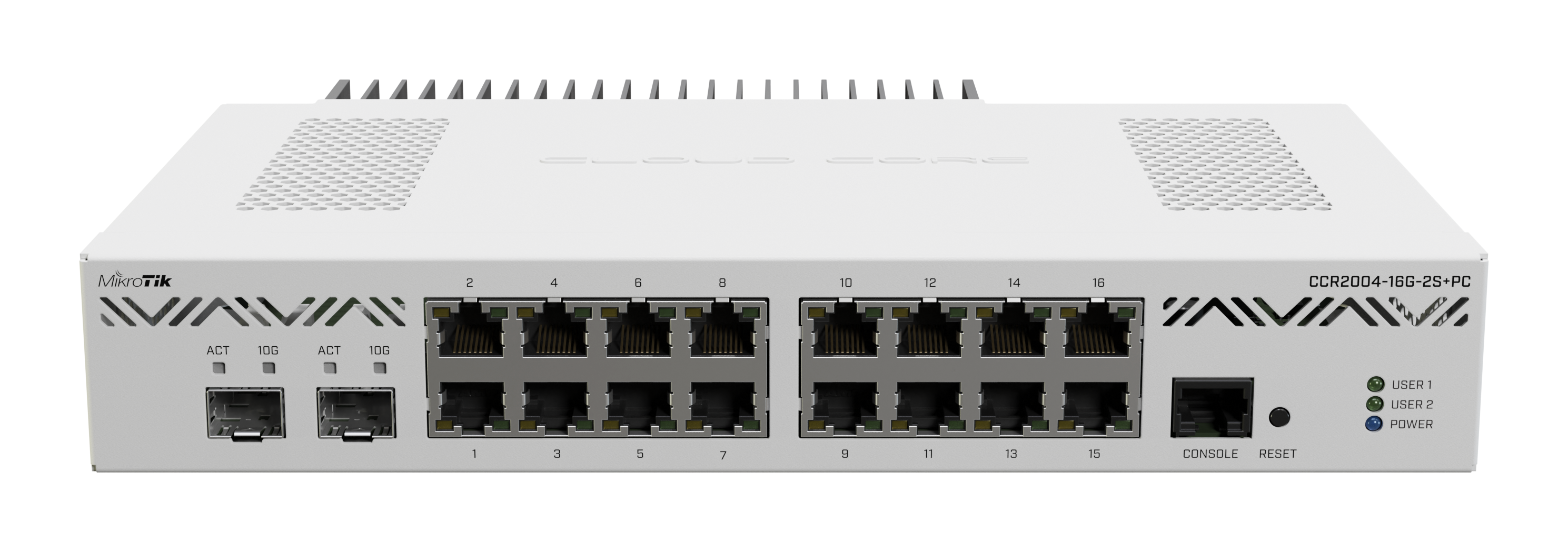 The CCR2004-16G-2S+PC comes with two sets of 8 Gigabit Ethernet ports, a pair of 10G SFP+ cages, an RJ45 console port, 4GB of RAM, and 128MB of NAND local storage.