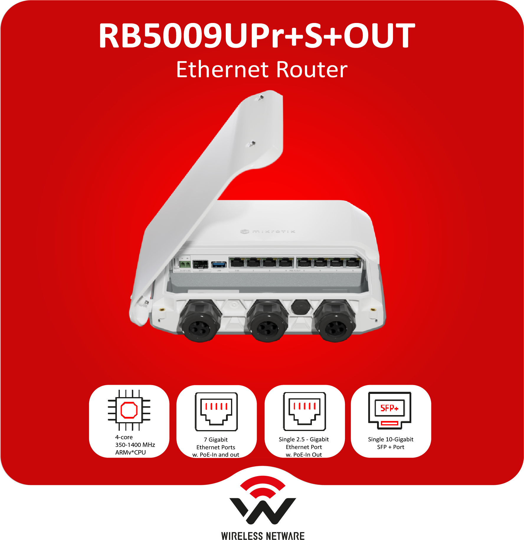 RB5009UPr+S+OUT: This powerful outdoor router comes with Reverse PoE support, making it ideal for outdoor networking scenarios where power sources are scarce. Its rugged design ensures durability in harsh weather conditions.