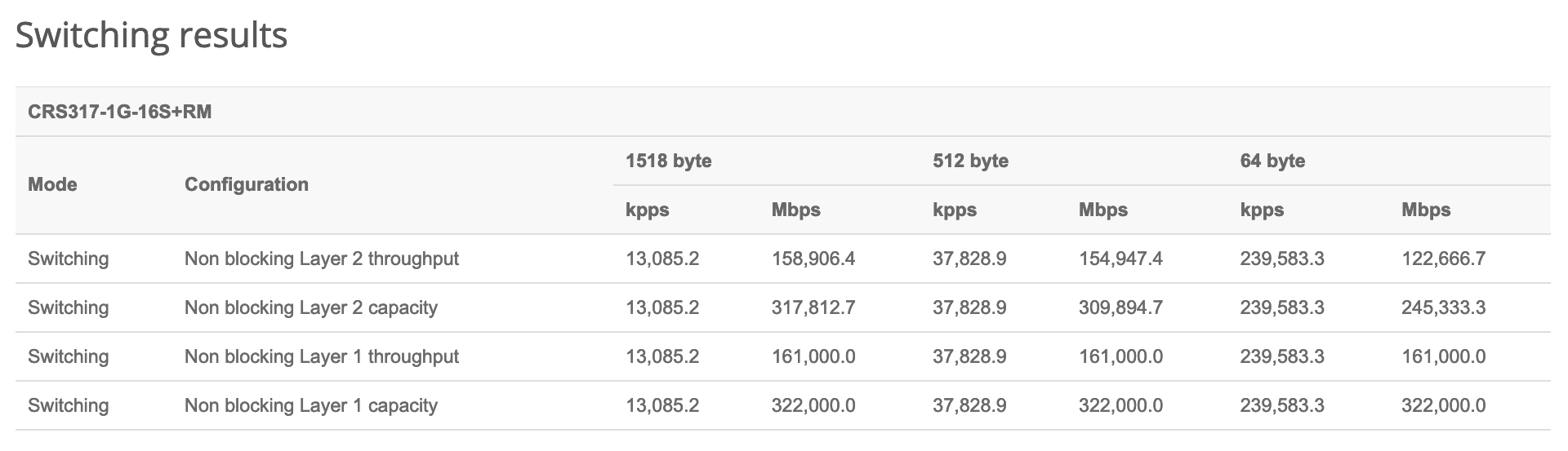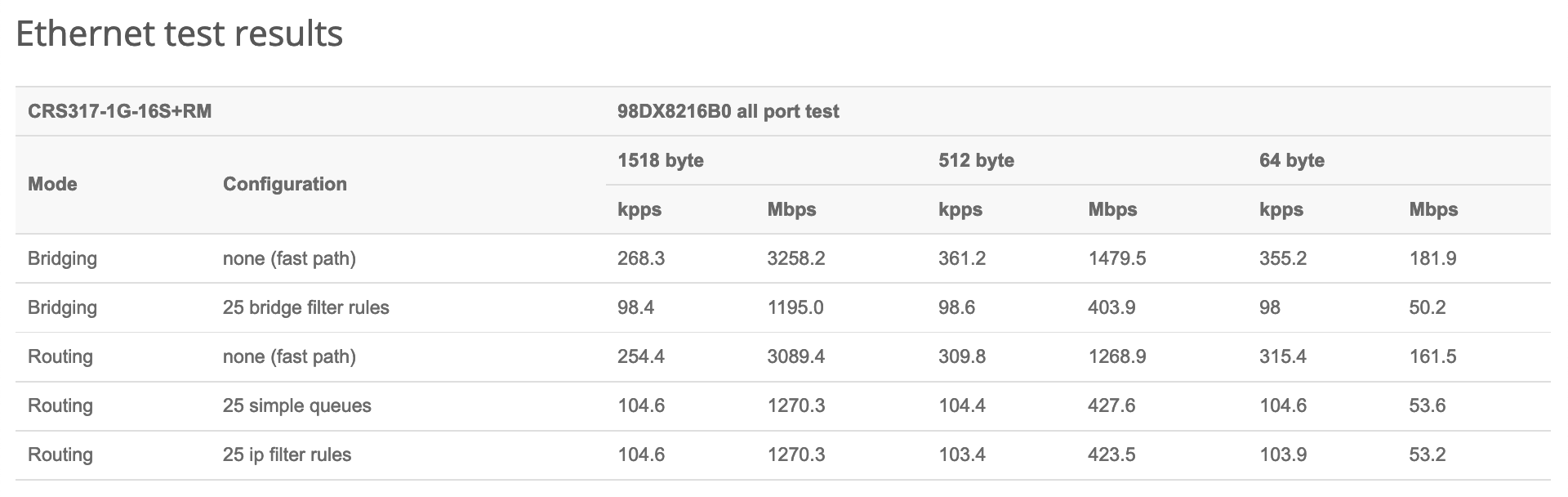 Moreover, this device has shown pretty solid results when it comes to real-life performance. Courtesy of MikroTik, you can see the performance results of the CRS317-1G-16S+RM down below: