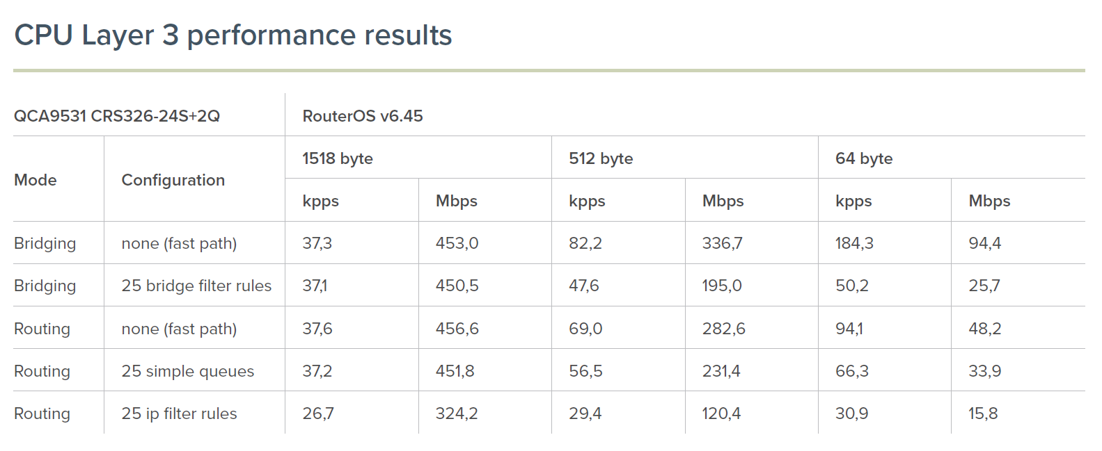 Down below, you can review the performance test results of the CRS326!